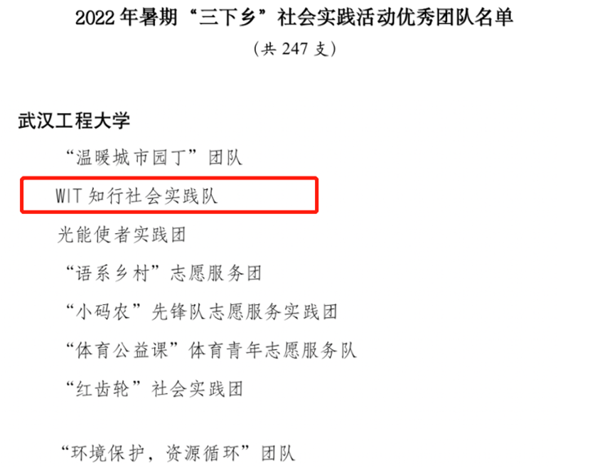 WIT知行社会实践队自2020年成立以来,一直践行“行远自迩铭初心,致知力行谱新篇”的实践理念,前往武汉、上海、嘉兴、利川等地开展投身疫情防控、宣传党史故事、助力乡村振兴等社会实践活动。实践活动被中青网、湖北日报、长江云、湖北高校思政网等主流媒体报道10余次。