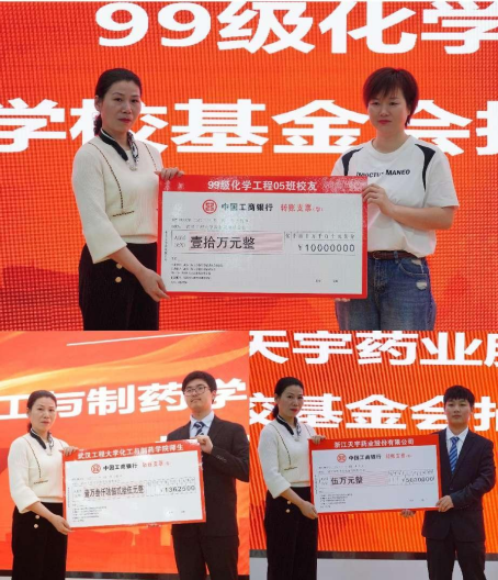 师生代表陈泽旭、99级化学工程5班王金岚校友、浙江天宇药业股份有限公司代表分别向学校教育发展基金会捐赠款项支票。通过前期91视频