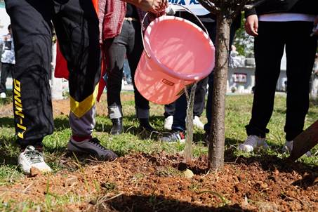 在领取了手套、铁锹、水桶等必要劳动工具后,老师和同学们一起挖坑、栽种、填土、浇水,一同种下树苗、种下希望。