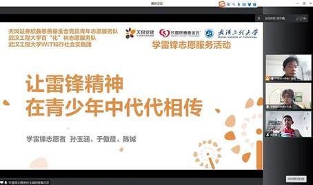 3月4日上午,学院WIT知行实践团成员于傲晨、孙玉涵联合天风证券志愿者陈铖为寒假期间结对的东亭社区孩子们带去了一堂“让雷锋精神在青少年中代代相传”线上课程,课后志愿者们带着孩子们一起在社区做清洁,共同维护美好环境。